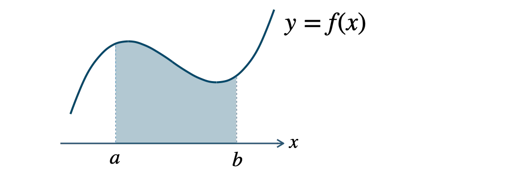 区間 \(a{\small ~≦~}x{\small ~≦~}b\) の範囲で、常に \(f(x){\small ~≧~}0\) である曲線 \(y=f(x)\) と、曲線、2直線 \(x=a\) 、\(x=b\) で囲まれた図形の面積 \(S\) は、
