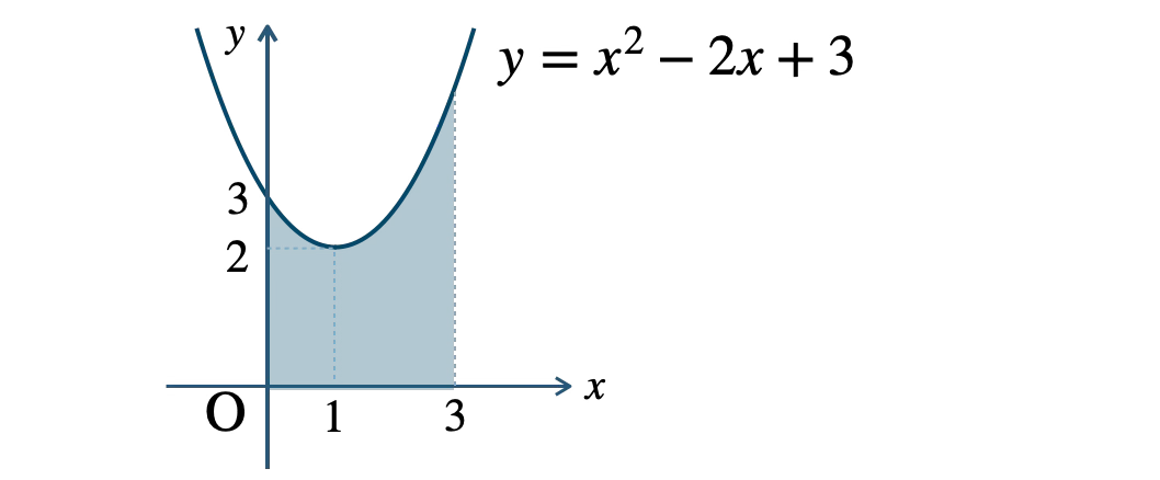 これより、囲まれた図形は、曲線の上側にあり区間 \([\,0~,~3\,]\) より、