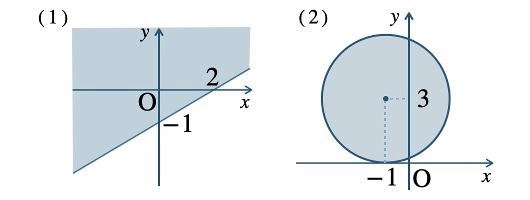 図形と方程式 60不等式\(x^2+y^2 {\small ~≦~} 4\)、\(x^2+y^2-2x+4y-4 \gt 0\) のそれぞれの表す領域の図示の方法は?