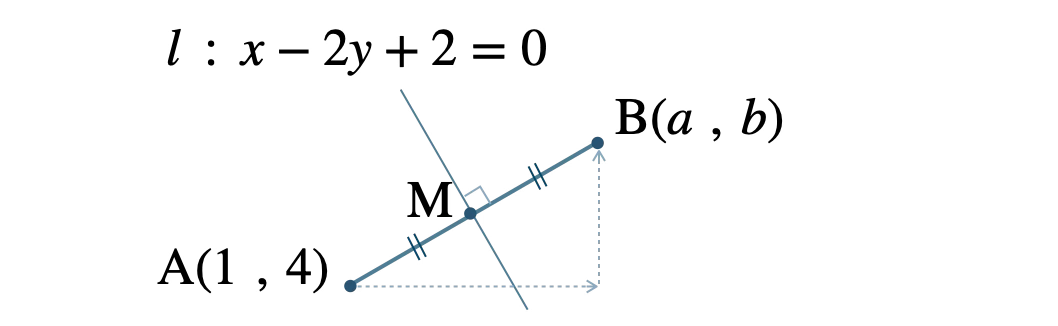 図形と方程式 24直線 \(x-2y+2=0\) に関して、点 \({\rm A}(1~,~4)\) と対称な点 \({\rm B}\) の座標の求め方は?