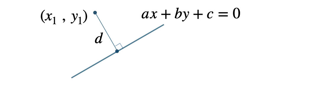 \(d=\displaystyle\frac{\,|\,ax_1+by_1+c\,|\,}{\,\sqrt{a^2+b^2}\,}\)
