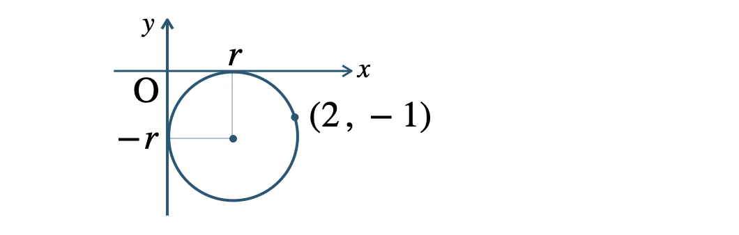 円は、第4象限にあり、半径を \( r~(r \gt 0) \) とすると、中心の \( x \) 座標は \( r \)、\( y \) 座標は \( -r \) となる