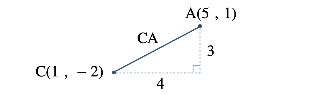 中心 \( {\rm C}(1~,~-2) \) と点 \( {\rm A}(5~,~1) \) との距離は、
