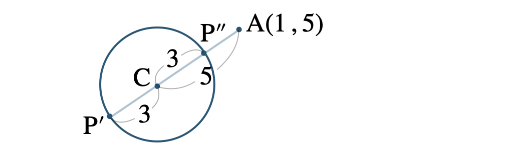 円 \( (x-1)^2+(y+2)^2=9 \) 上の点 \( {\rm P} \) と点 \( {\rm A}(5~,~1) \) との距離 \( {\rm PA} \) の最大値と最小値の求め方は?