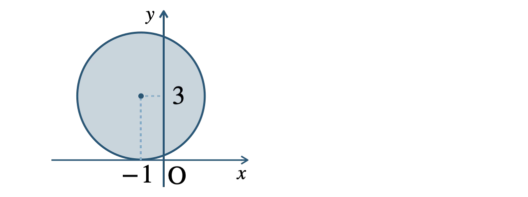 図より、中心 \((-1~,~3)\)、半径 \(3\) の円の内側で、境界線を含むので、