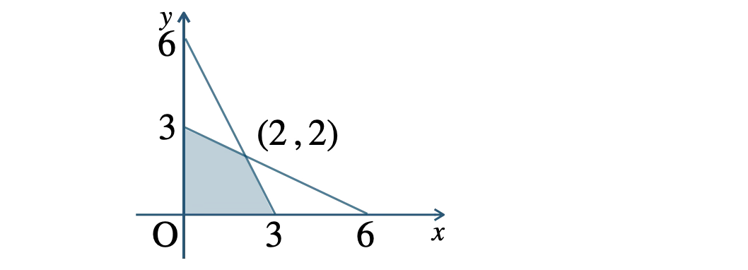 \(\begin{eqnarray}~~~2y&{\small ~≦~}&-x+6\\[3pt]~~~y&{\small ~≦~}&-\displaystyle \frac{\,1\,}{\,2\,}x+3\end{eqnarray}\)