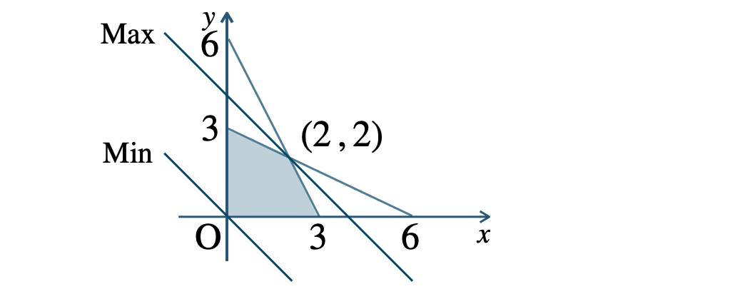 \(x~,~y\) が不等式 \(x{\small ~≧~}0~,~\)\(y{\small ~≧~}0~,~\)\(2x+y{\small ~≦~}6~,~\)\(x+2y{\small ~≦~}6\) を満たすとき、\(x+y\) の最大値・最小値の求め方は?