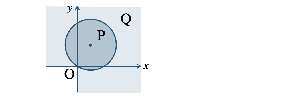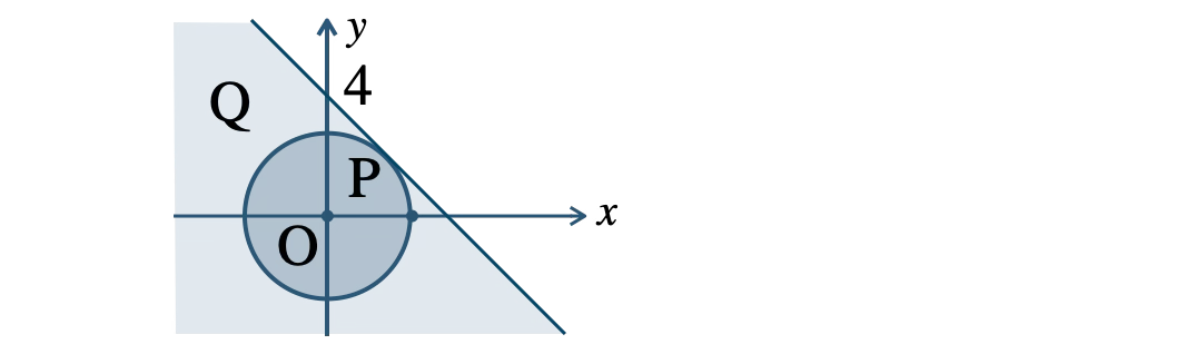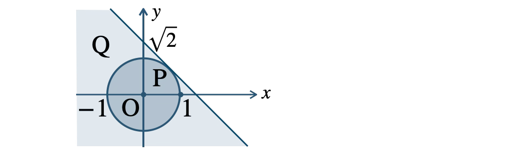 図より、\({\rm P} \subset {\rm Q}\)( \({\rm P}\) が \({\rm Q}\) の部分集合 )であるから、
