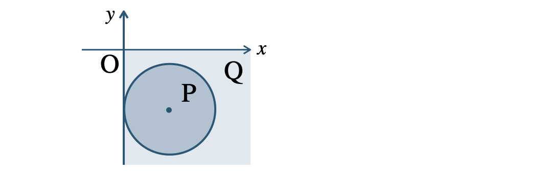 よって、中心 \((3~,~4)\)、半径 \(5\) の円の内部で、この領域を \({\rm P}\) とする