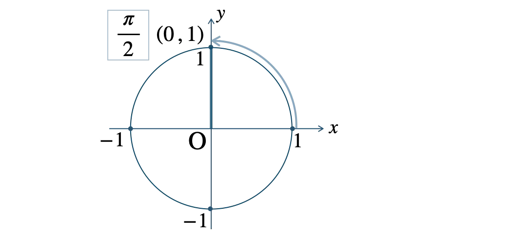 \(\theta=\displaystyle \frac{\,\pi\,}{\,2\,}\) のとき、\(\displaystyle \frac{\,\pi\,}{\,2\,}\) が \(1\) 個分であり、半径 \(1\) の円の点 \((0~,~1)\) の位置にある