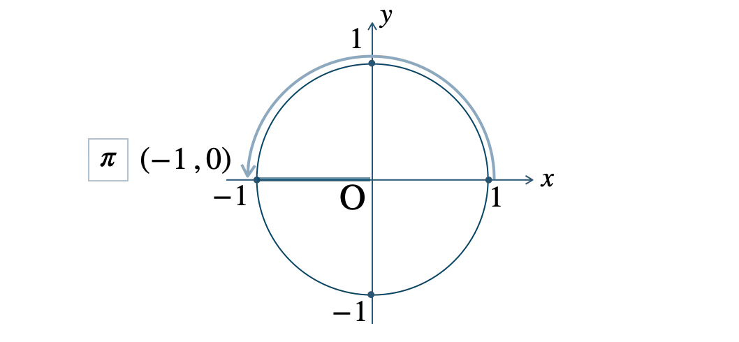 \(\theta=\pi=\displaystyle \frac{\,2\,}{\,2\,}\pi\) のとき、\(\displaystyle \frac{\,\pi\,}{\,2\,}\) が \(2\) 個分であり、半径 \(1\) の円の点 \((-1~,~0)\) の位置にある