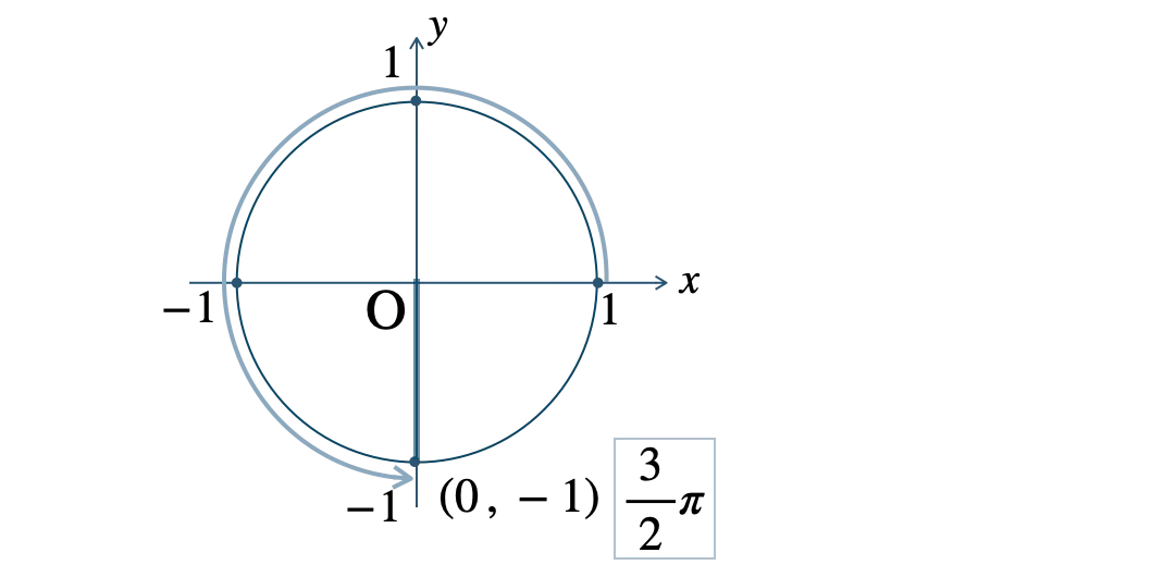 \(\theta=\displaystyle \frac{\,3\,}{\,2\,}\pi\) のとき、\(\displaystyle \frac{\,\pi\,}{\,2\,}\) が \(3\) 個分であり、半径 \(1\) の円の点 \((0~,~-1)\) の位置にある