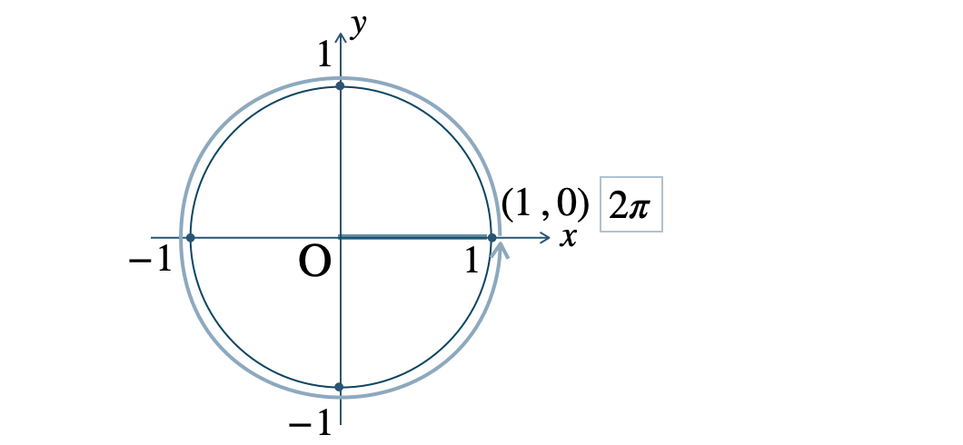 \(\theta=2\pi=\displaystyle \frac{\,4\,}{\,2\,}\pi\) のとき、\(\displaystyle \frac{\,\pi\,}{\,2\,}\) が \(4\) 個分であり、半径 \(1\) の円の点 \((1~,~0)\) の位置にある