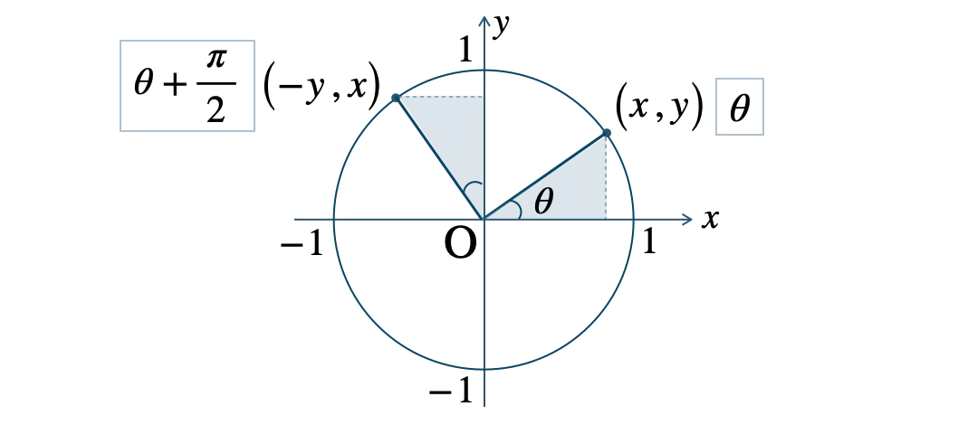 単位円上の角 \(\theta\) の点を \((x~,~y)\) とすると、角 \(\theta+\displaystyle\frac{\,\pi\,}{\,2\,}\) の点は \((-y~,~x)\) となるので、