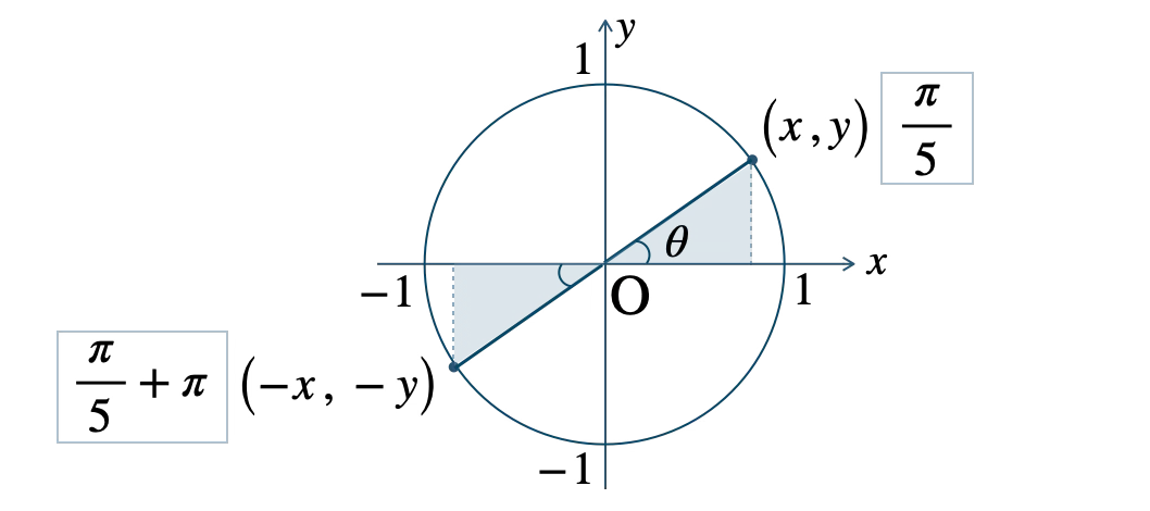 単位円上の角 \(\theta\) の点を \((x~,~y)\) とすると、角 \(\theta+\pi\) の点は \((-x~,~-y)\) となるので、