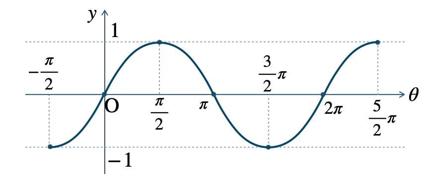 グラフより、\(y=\sin\theta\) の周期は \(2\pi\)