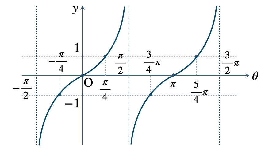 グラフより、\(y=\tan\theta\) の周期は \(\pi\)