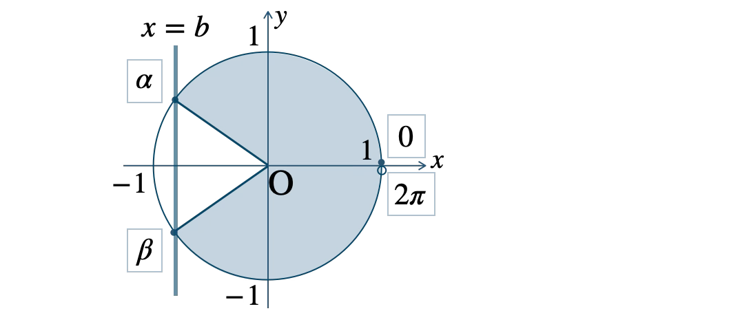 図より、\(0{\small ~≦~}\theta\lt\alpha~,~\)\(\beta{\small ~≦~}\theta\lt 2\pi\)