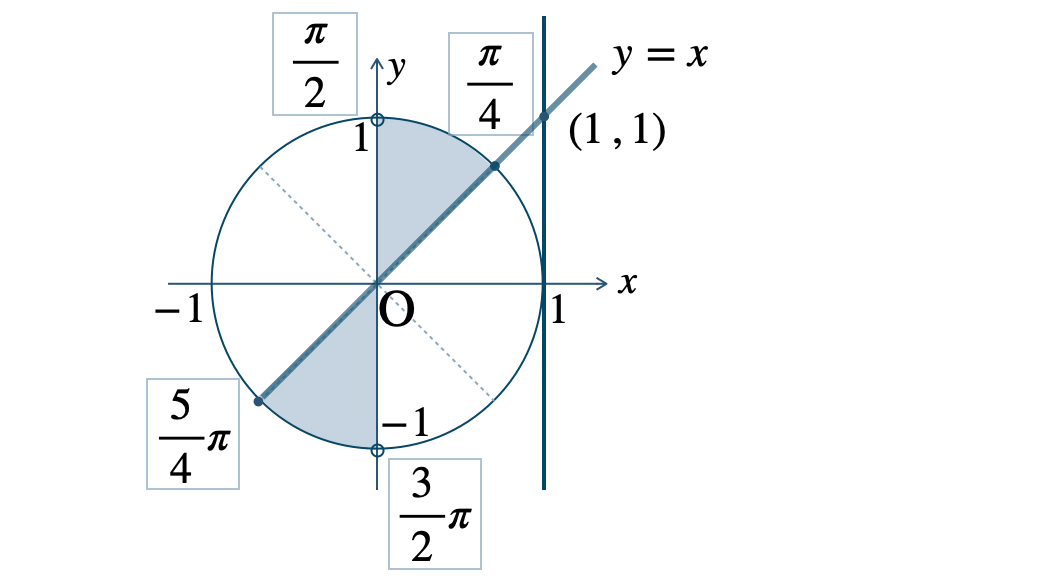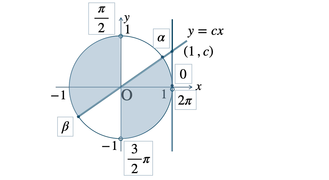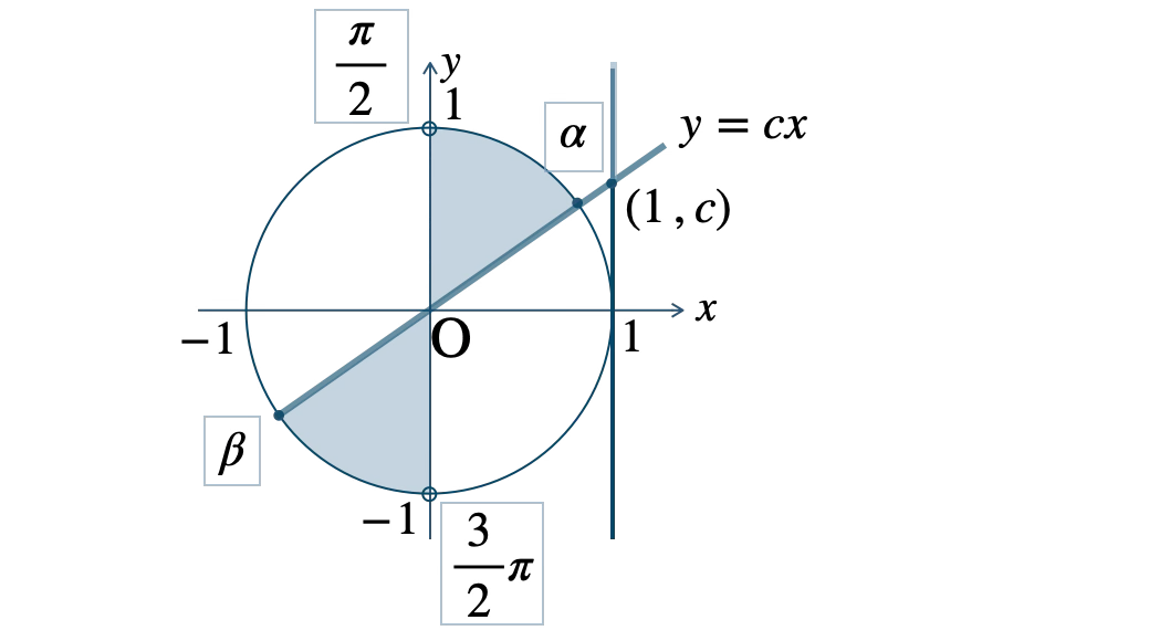 図より、\(\alpha{\small ~≦~}\theta\lt\displaystyle\frac{\,\pi\,}{\,2\,}~,~\)\(\beta{\small ~≦~}\theta\lt\displaystyle\frac{\,3\,}{\,2\,}\pi\)
