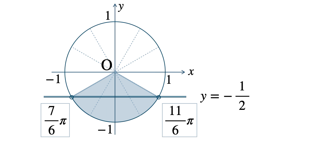 \(y=-\displaystyle\frac{\,1\,}{\,2\,}\) より小さい範囲の動径が不等式の解となり、\(0{\small ~≦~}\theta\lt 2\pi\) の範囲で、
