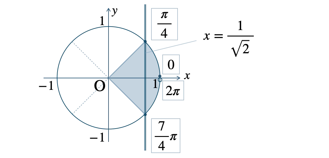 \(x=\displaystyle\frac{\,1\,}{\,\sqrt{2}\,}\) 以上の範囲の動径が不等式の解となり、\(0{\small ~≦~}\theta\lt 2\pi\) の範囲で、