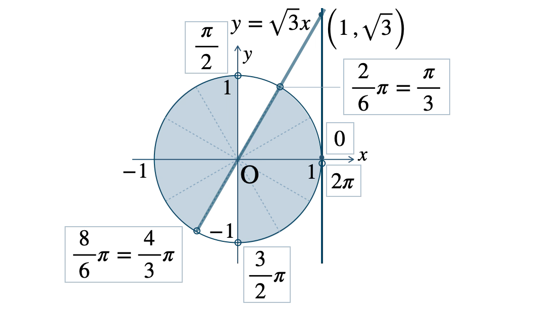 直線 \(x=1\) 上の点 \((1~,~\sqrt{3})\) より小さい範囲であり、そのときの動径が不等式の解となり、\(0{\small ~≦~}\theta\lt 2\pi\) の範囲で、