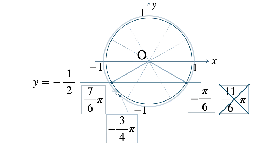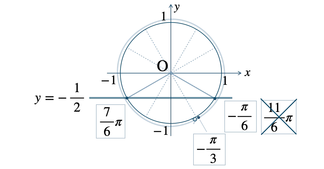 この範囲で、単位円と \(y=-\displaystyle\frac{\,1\,}{\,2\,}\) の交点は、