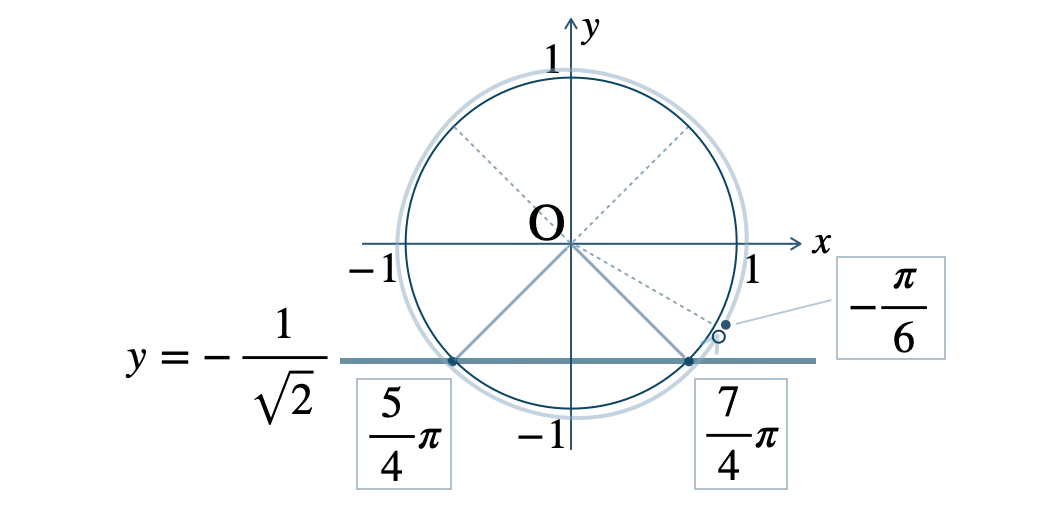 この範囲で、単位円と \(y=-\displaystyle\frac{\,1\,}{\,\sqrt{2}\,}\) の交点は、