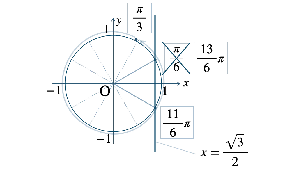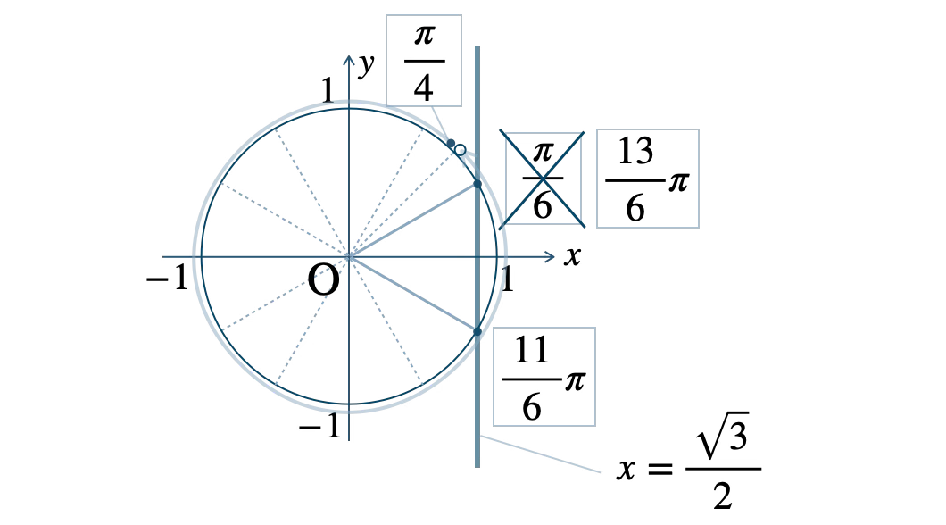 この範囲で、単位円と \(x=\displaystyle\frac{\,\sqrt{3}\,}{\,2\,}\) の交点は、