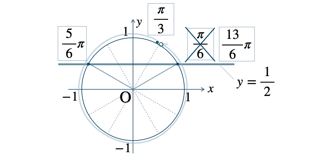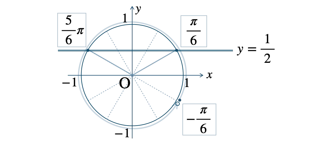 この範囲で、単位円と \(y=\displaystyle\frac{\,1\,}{\,2\,}\) の交点は、