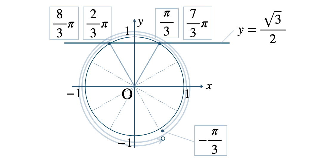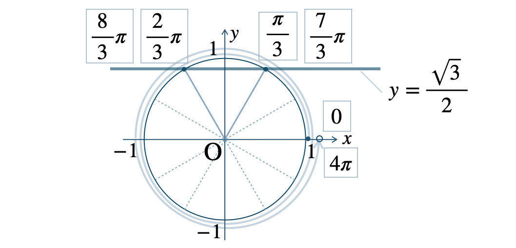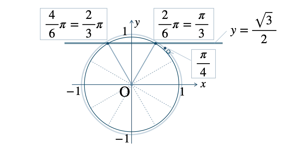 この範囲で、単位円と \(y=\displaystyle\frac{\,\sqrt{3}\,}{\,2\,}\) の交点は、