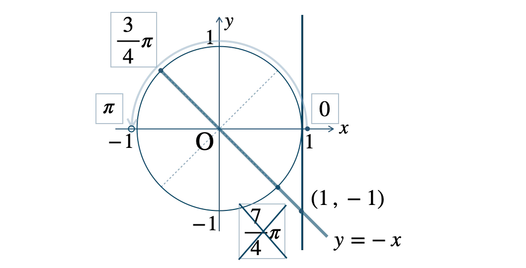 この範囲で、直線 \(x=1\) 上の点 \((1~,~-1)\) と原点を結ぶ直線と単位円との交点は、