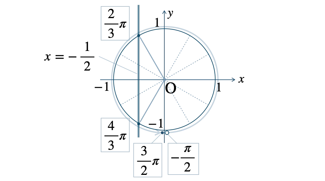 この範囲で、単位円と \(x=-\displaystyle\frac{\,1\,}{\,2\,}\) の交点は、