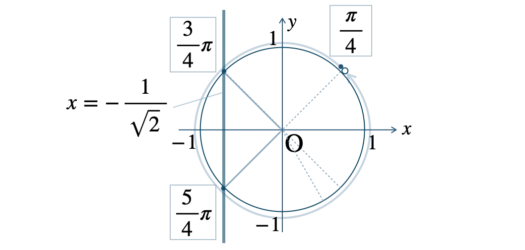 この範囲で、単位円と \(x=-\displaystyle\frac{\,1\,}{\,\sqrt{2}\,}\) の交点は、