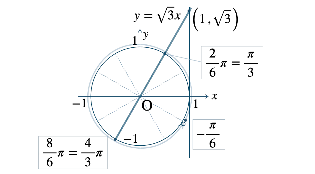 この範囲で、直線 \(x=1\) 上の点 \((1~,~\sqrt{3})\) と原点を結ぶ直線と単位円との交点は、