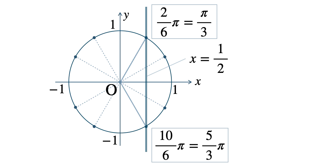 したがって、\(\theta=\displaystyle \frac{\,\pi\,}{\,3\,}~,~\displaystyle \frac{\,5\pi\,}{\,3\,}\)