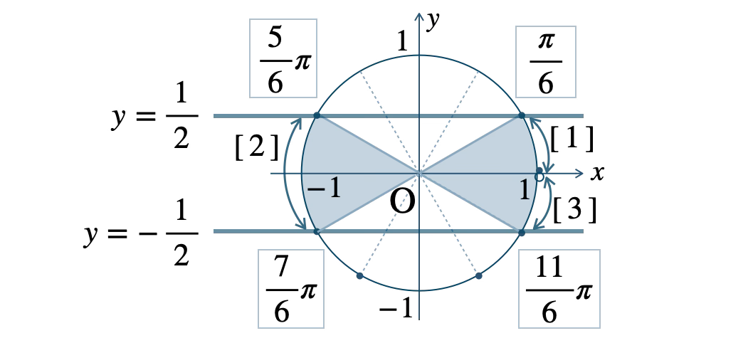 これより、\(0{\small ~≦~}\theta\lt 2\pi\) の範囲で、\(y=-\displaystyle \frac{\,1\,}{\,2\,}\) 以上、\(y=\displaystyle \frac{\,1\,}{\,2\,}\) 以下の範囲が、不等式の解となるので、