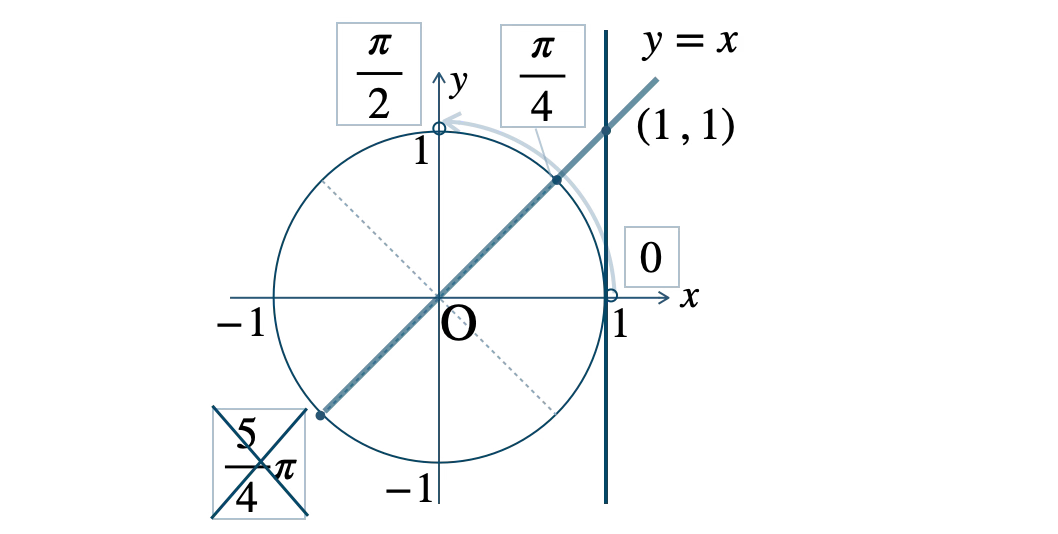 直線 \(x=1\) 上の点 \((1~,~1)\) と原点を結ぶ直線と単位円との交点より、