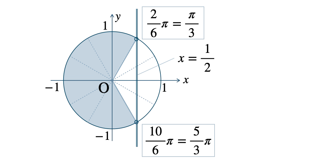 動径は基本角 \(\displaystyle \frac{\,\pi\,}{\,6\,}\) の2個分と10個分であり、\(x\lt \displaystyle \frac{\,1\,}{\,2\,}\) の範囲である。