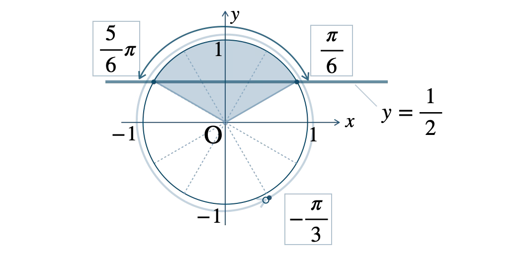 単位円上の \(y=\displaystyle \frac{\,1\,}{\,2\,}\) との交点より、