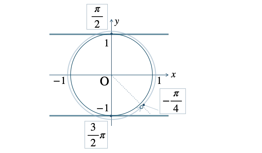 \(-\displaystyle \frac{\,\pi\,}{\,4\,}{\small ~≦~}x-\displaystyle \frac{\,\pi\,}{\,4\,}\lt 2\pi-\displaystyle \frac{\,\pi\,}{\,4\,}\) より、