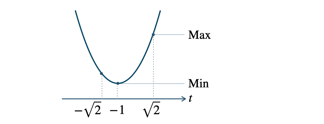 \(-\sqrt{\,2\,}{\small ~≦~}t{\small ~≦~}\sqrt{\,2\,}\) の範囲で、