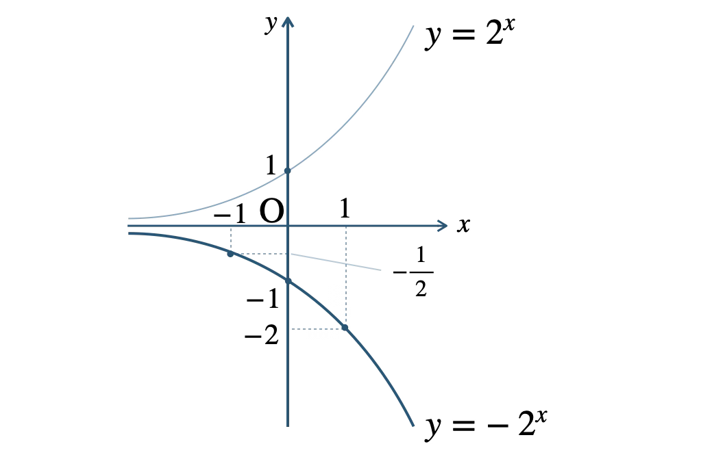 \(y=2^x\) のグラフを \(x\) 軸に関して対称移動したグラフで、点 \((0~,~-1)\) を通り、右下がりのグラフ