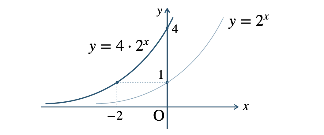 これより、\(y=2^x\) を \(x\) 軸方向に \(-2\) 平行移動したグラフ