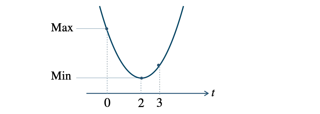 ③ グラフより、最大値・最小値とそのときの \(t\) の値を求め、\(x\) の値を求める。
