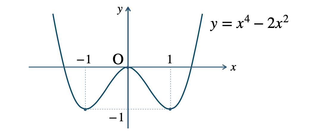 また、点 \((-1~,~-1)~,~\)\((0~,~0)~,~\)\((1~,~-1)\) を通るので、\(y=x^4-2x^2\) のグラフは、