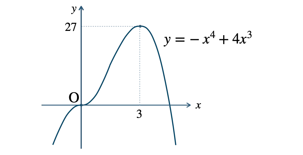 また、点 \((0~,~0)~,~\)\((3~,~27)\) を通るので、\(y=-x^4+4x^3\) のグラフは、