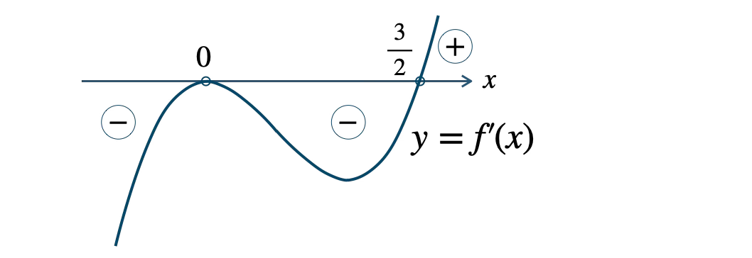 \(\begin{array}{c|ccccc}x & \cdots & 0 & \cdots & \displaystyle \frac{\,3\,}{\,2\,} & \cdots \\\hline f^{\prime}(x) & – & 0 & – & 0 & + \\\hline f(x) & \searrow & 0 & \searrow & -\displaystyle \frac{\,27\,}{\,16\,} & \nearrow\end{array}\)