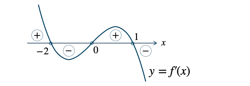 \(x \lt -2\) のとき、\(f^{\prime}(x) \lt 0\)
