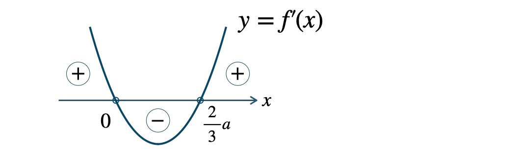 \(f^{\prime}(x)=0\) より \(x=0~,~\displaystyle \frac{\,2\,}{\,3\,}a\)